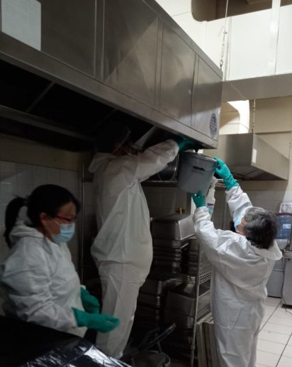 Limpieza de campanas, filtros y ducto de extracción, pisos, paredes y equipos de cocina.